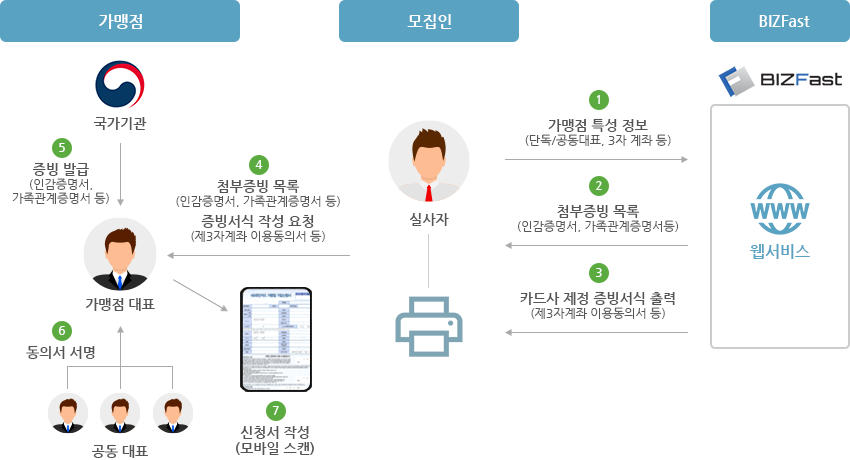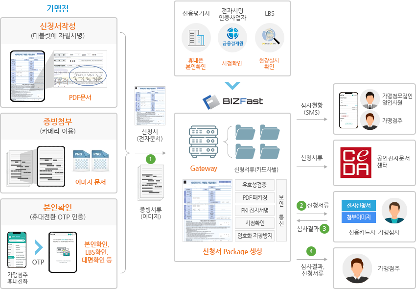 BIZFast 서비스는 모바일로 가맹점 현장에서 가입신청서를 작성하여 가맹점이 직접 신용카드사에 제출하는 모바일 가맹신청서비스입니다.