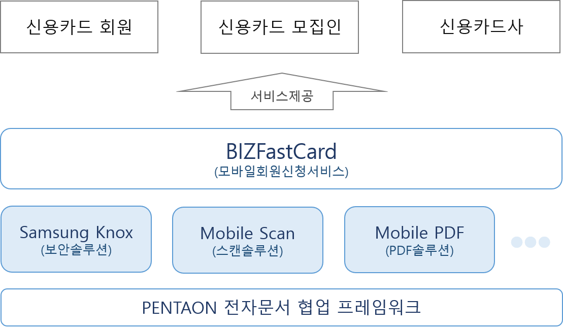 BIZFastCard 서비스는 현장에서 가입신청서를 작성하고 신뢰도 높은 전자문서를 카드사로 전송하여 가입절차를 처리하는 모바일 회원신청서비스입니다.