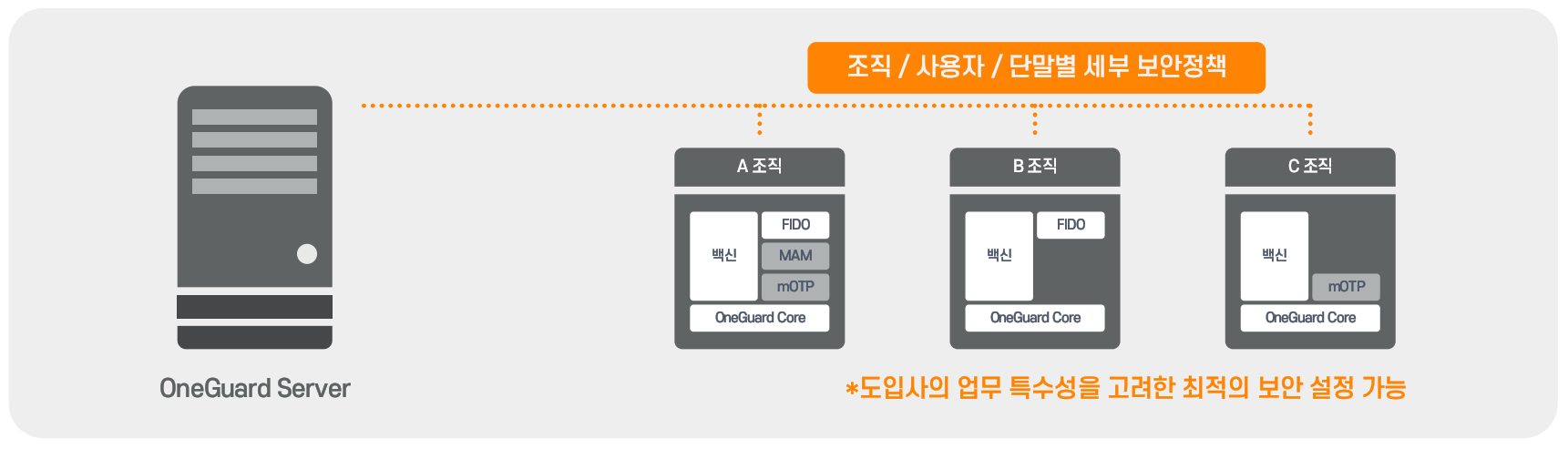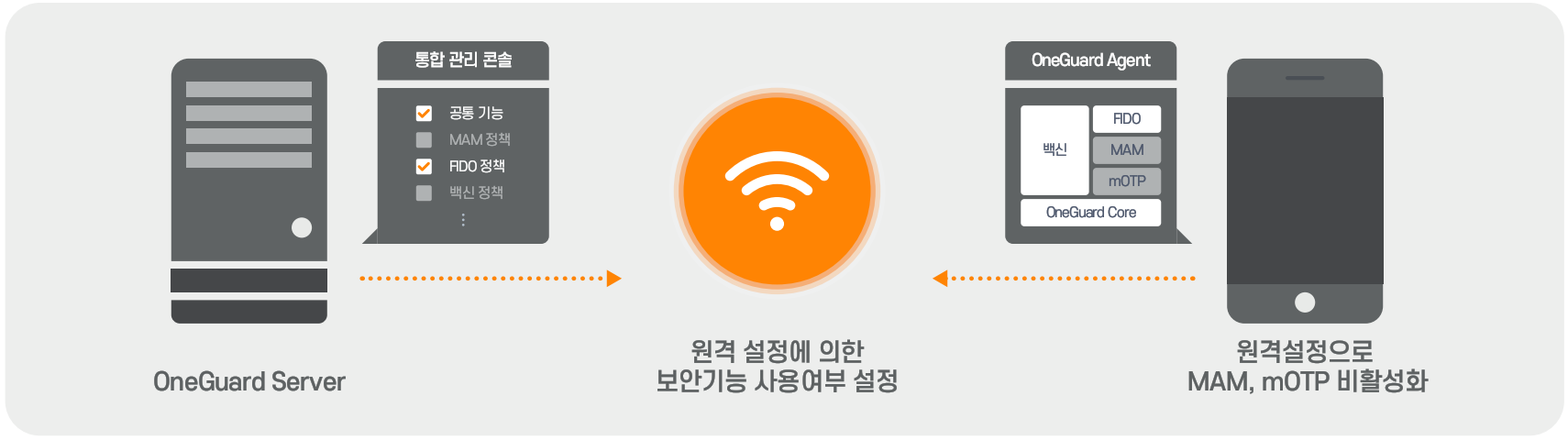 OneGuard는 차세대 스마트워크 환경에서 필요 서버 및 단일의 추가 작업 없이 통합 관리 콘솔을 이용하여 보안 기능의 사용여부를 손쉽게 설정할 수 있습니다.