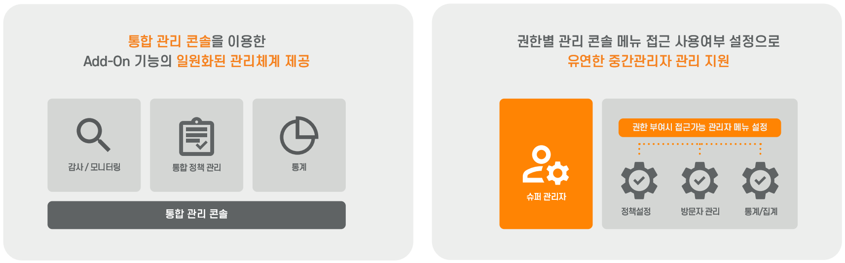 OneGuard는 Add-On 기능의 일원화된 관리체계를 제공하기 위하여 통합 관리 콘솔을 제공합니다. 또한, 통합 관리 콘솔은 권한 기반으로 부관리자 설정 기능을 지원하여 유연한 관리체계 구축이 가능합니다.
